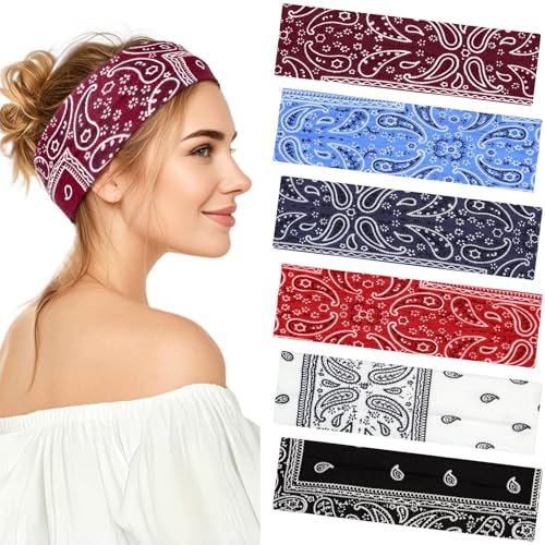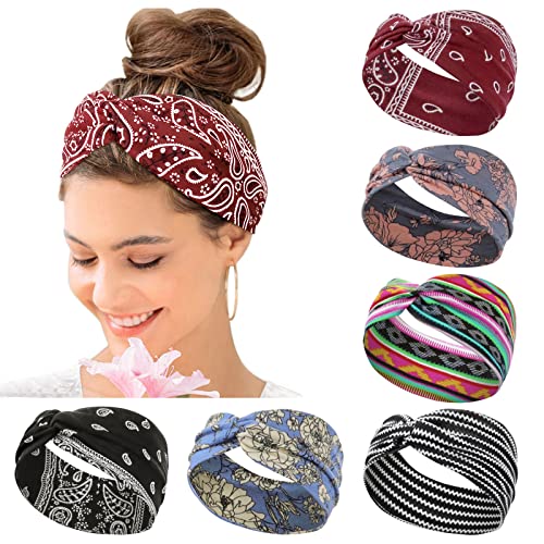 Tumurup Headbands for Women's Hair - 6 Pack Fashion Elastic Boho Hair Bands with Print Sports Head Band for Yoga & Gym, Non-Slip Hair Accessories