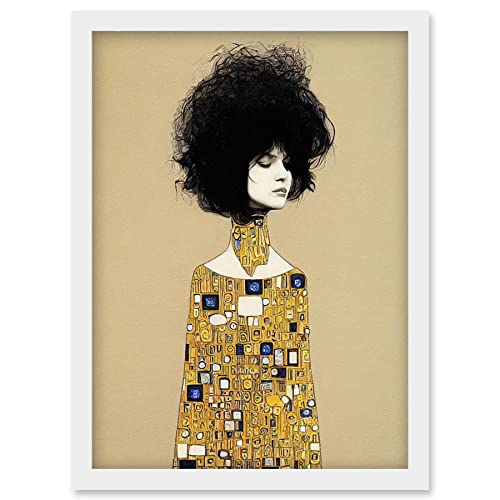 Wee Blue Coo Klimt Style Retro Boho Afro Hair Abstract Gold Dress Artwork Framed Wall Art Print A4