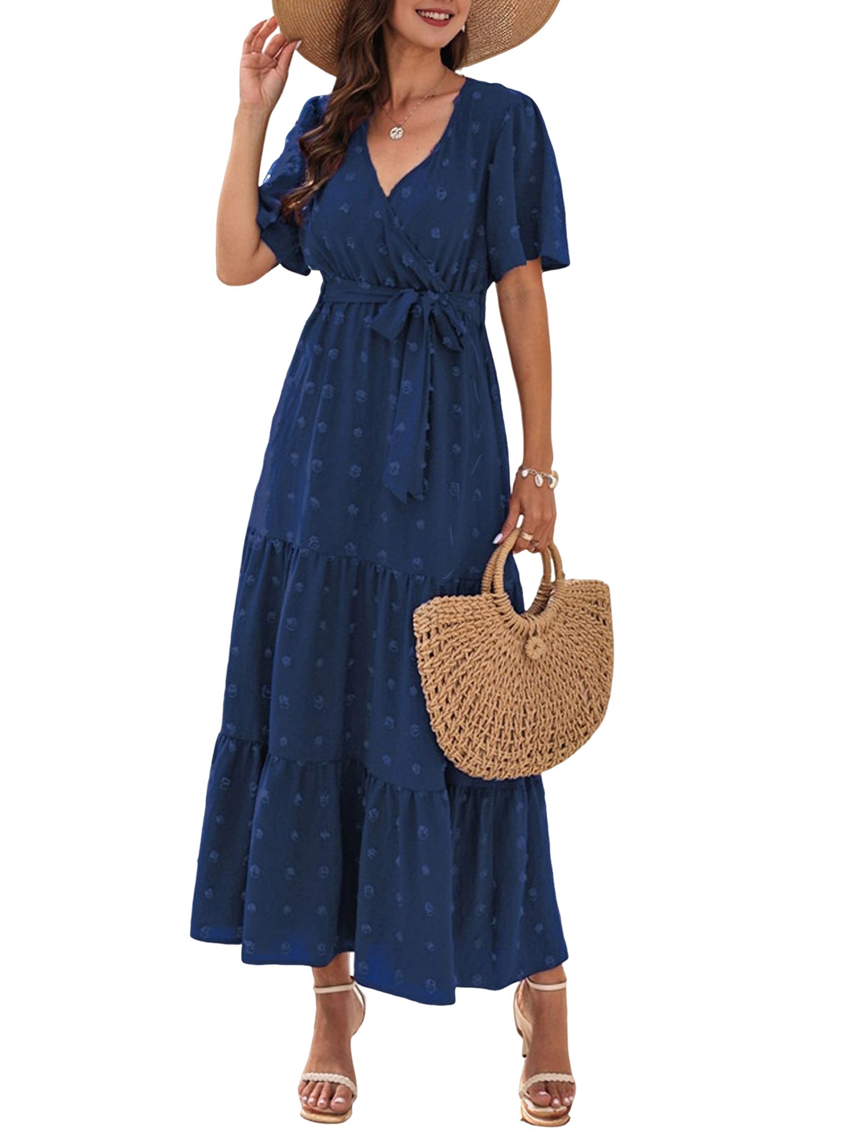 Boho Dot Summer Maxi Dresses for Women Wrap V Neck Short Sleeve Long Flowy8898