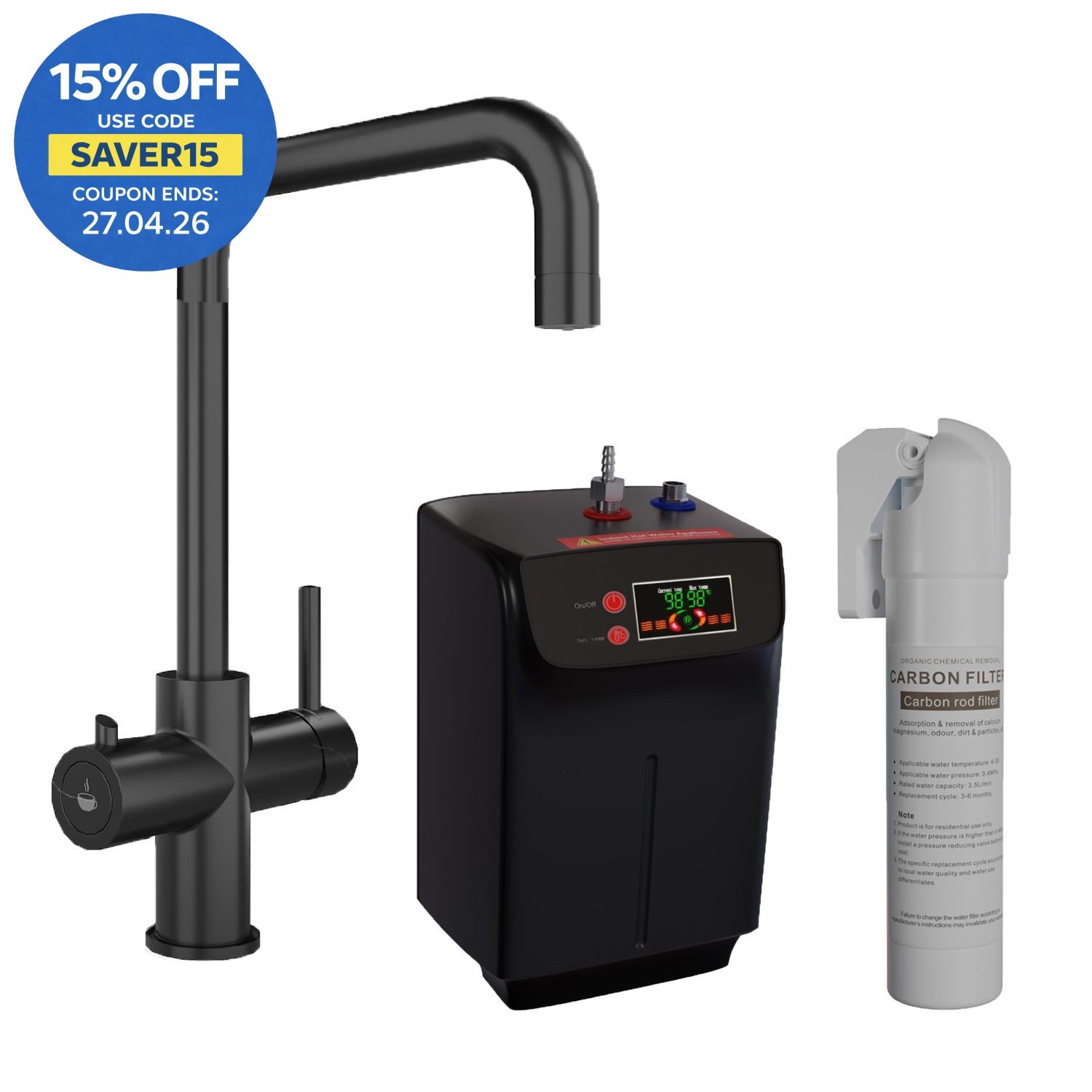 3 in 1 Instant Boiling Water Black Kitchen Tap Hot Cold + Filter + Digital Tank