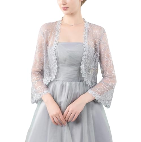FWSHANGMAO Women’S Lace Shrugs Bolero Cardigan,Elegant Sheer Crop Short Jacket 3/4 Sleeves Bolero Shrug Crochet Cardigan For Wedding Evening Dress,Grey,S