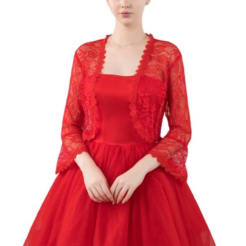 FWSHANGMAO Women’S Lace Shrugs Bolero Cardigan,Elegant Sheer Crop Short Jacket 3/4 Sleeves Bolero Shrug Crochet Cardigan For Wedding Evening Dress,Red,M