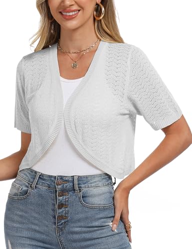 Totatuit Knitted Bolero Shrug for Women Vintage Short Sleeve Open Front Ladies Crop Crochet Cardigan Wedding Evening Jacket Spring Summer White
