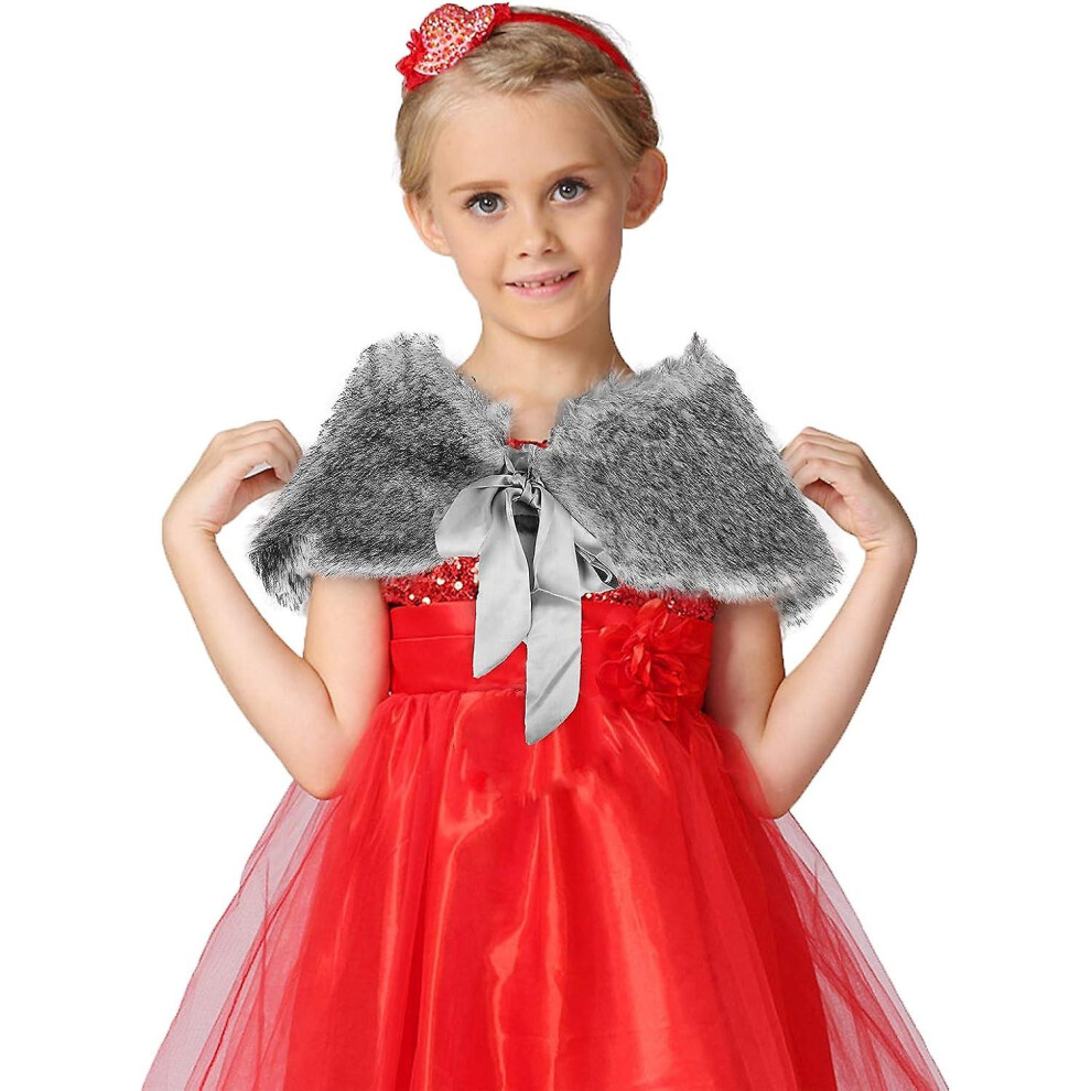 (Grey) Girls Faux Fur Bolero Wrap Shawl Soft Fluffy Dress Cape Pretty Flower Girls Wedding Shrug Winter Warm Plush Jacket Coat