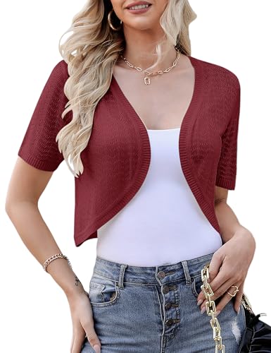 Totatuit Knitted Bolero Shrug for Women Vintage Short Sleeve Open Front Ladies Crop Crochet Cardigan Wedding Evening Jacket Spring Summer Red Wine
