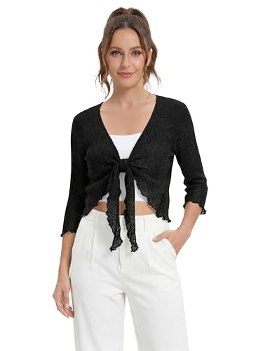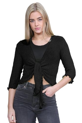 janisramone® Women s Shrugs, Double Fine Knit 3/4 Sleeve Tie Front Top, Bolero Cardigans for Women, Stretchy Cropped Cardigan, Lightweight Summer Shrug, Ladies Evening Tops Black