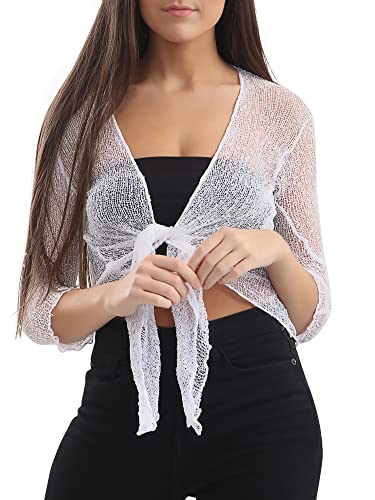 NetSetUK Women’s Fish Net Tie Up Shrug 3/4 Sleeve Fine Knitted Ladies Bolero Shrug Top Jacket Cardigan One Size White
