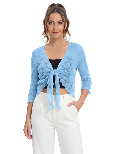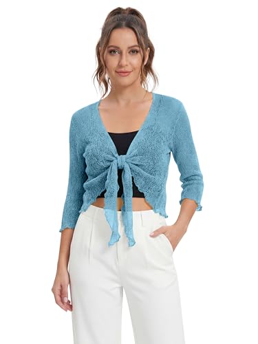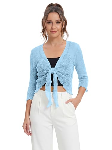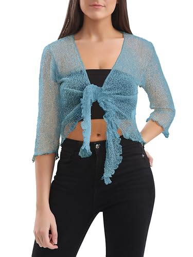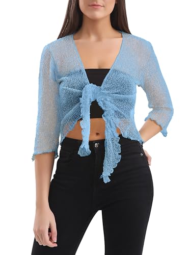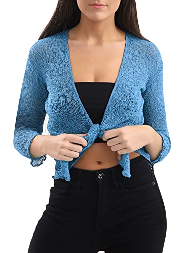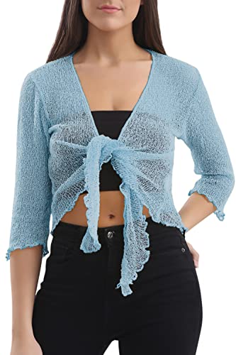 Love My Fashions® Women’s Fish Net Knitted Tie Up Bolero Shrug Top Ladies 3/4 Sleeve One Size Fits All Sky Blue