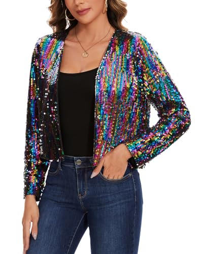 LADI TREND Ladies Sequin Cardigans Cropped Long Sleeves Shrugs Bolero Open Front Top Fully Lined Sweater for Show Parties Glee Feast Cocktail (Sliver M)