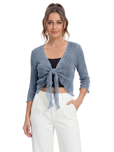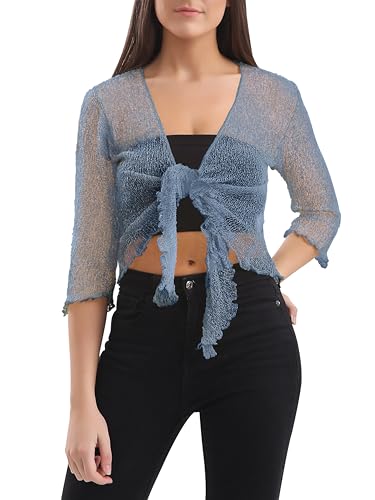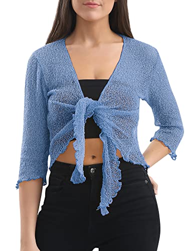 Love My Fashions® Women’s Fish Net Knitted Tie Up Bolero Shrug Top Ladies 3/4 Sleeve One Size Fits All Denim Blue