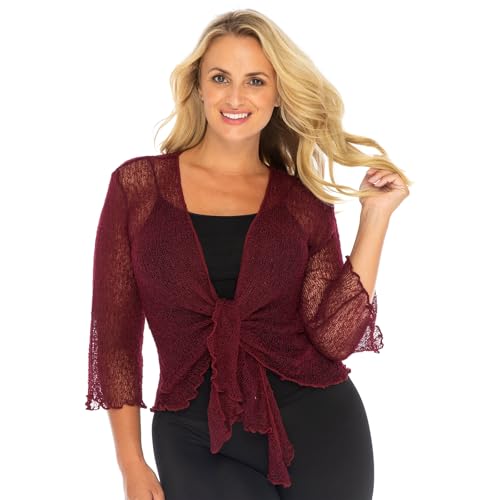 Love My Fashions® Women’s Fish Net Knitted Tie Up Bolero Shrug Top Ladies 3/4 Sleeve One Size Fits All Wine
