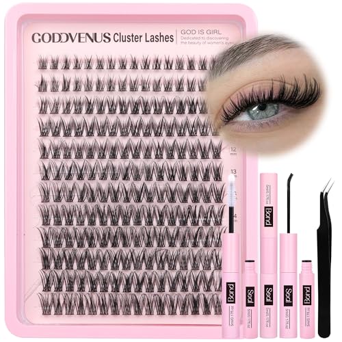Goddvenus Individual Eyelashes Wispy Lash Clusters Kit D Curl Eyelashes Individual Kit Natural Lash Extension Kit with Russian Cluster Lashes Glue Bond and Seal and Lash Tweezers (D Curl 192pcs)