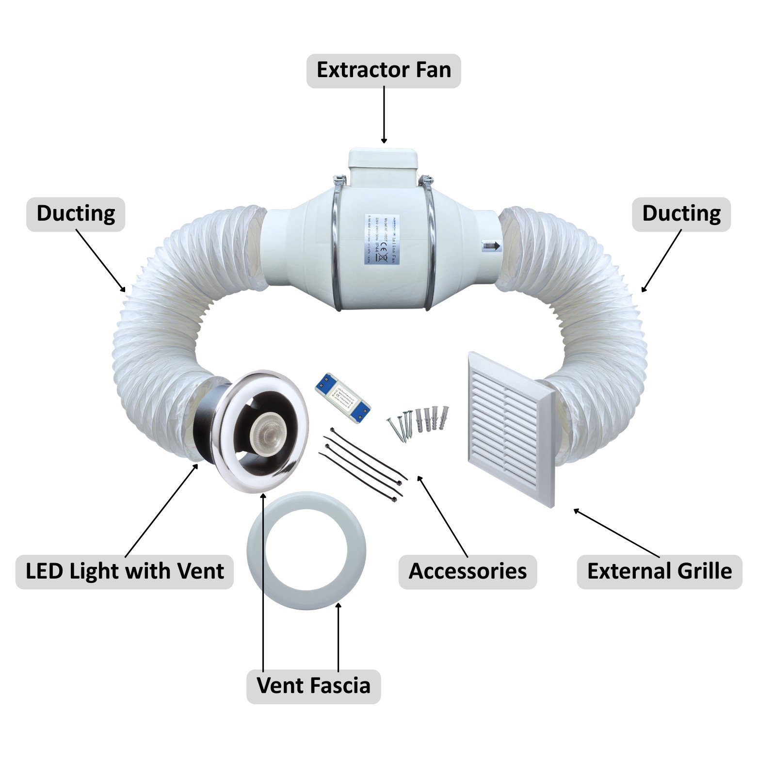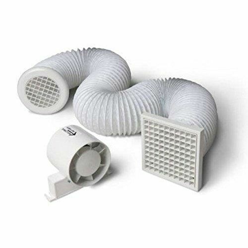 Inline Extractor Fan Kit 100mm 4" for Shower Bathroom c/w Loft Ducting & Grilles