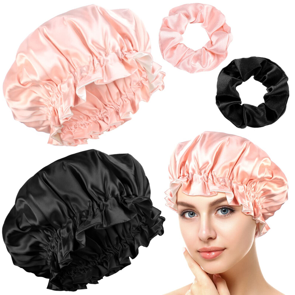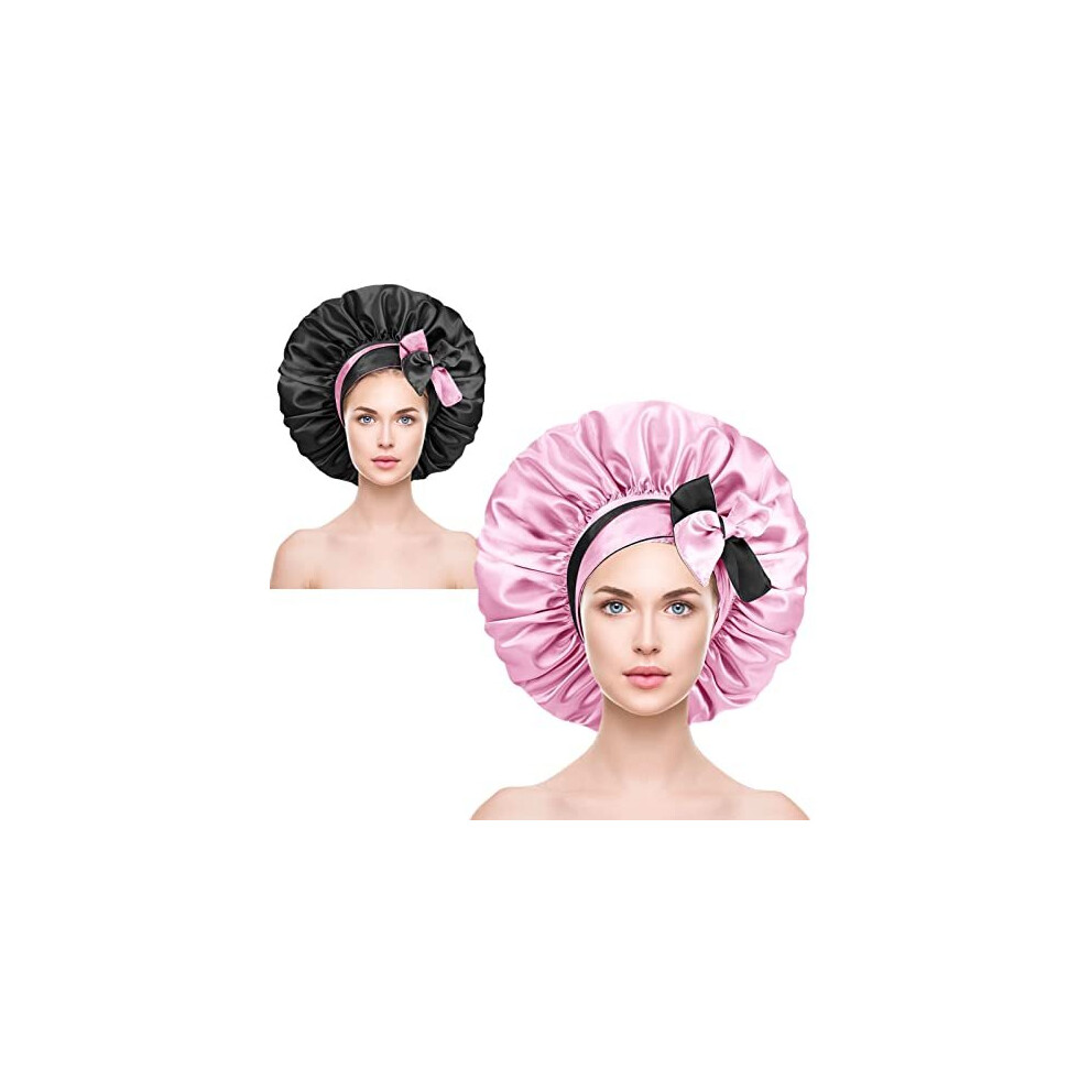 Euqvunn 2Pcs Satin Hair Bonnet, Hair Bonnet for Sleeping Adjustable with Wide Elastic Band, Two Color Double-Sided, Suitable for Night Sleep, Long/Straight/Curly Hair Protection (Black Pink)
