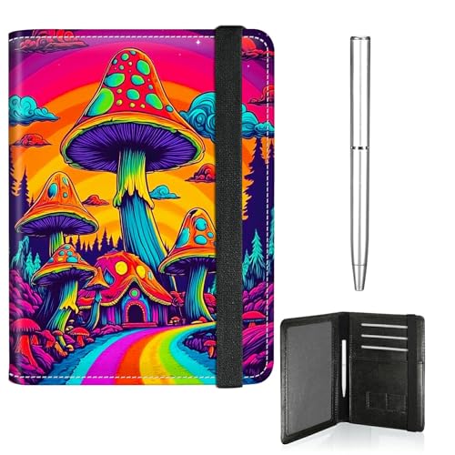 RWUTYTIUL Book Butterfly Passport Holder for Travel Women Men, Leather Passport and Vaccine Card Holder Combo Elastic Strap Cover Wallet RFID Blocking Passports Book Holders with Pen, Rainbow Mushroom