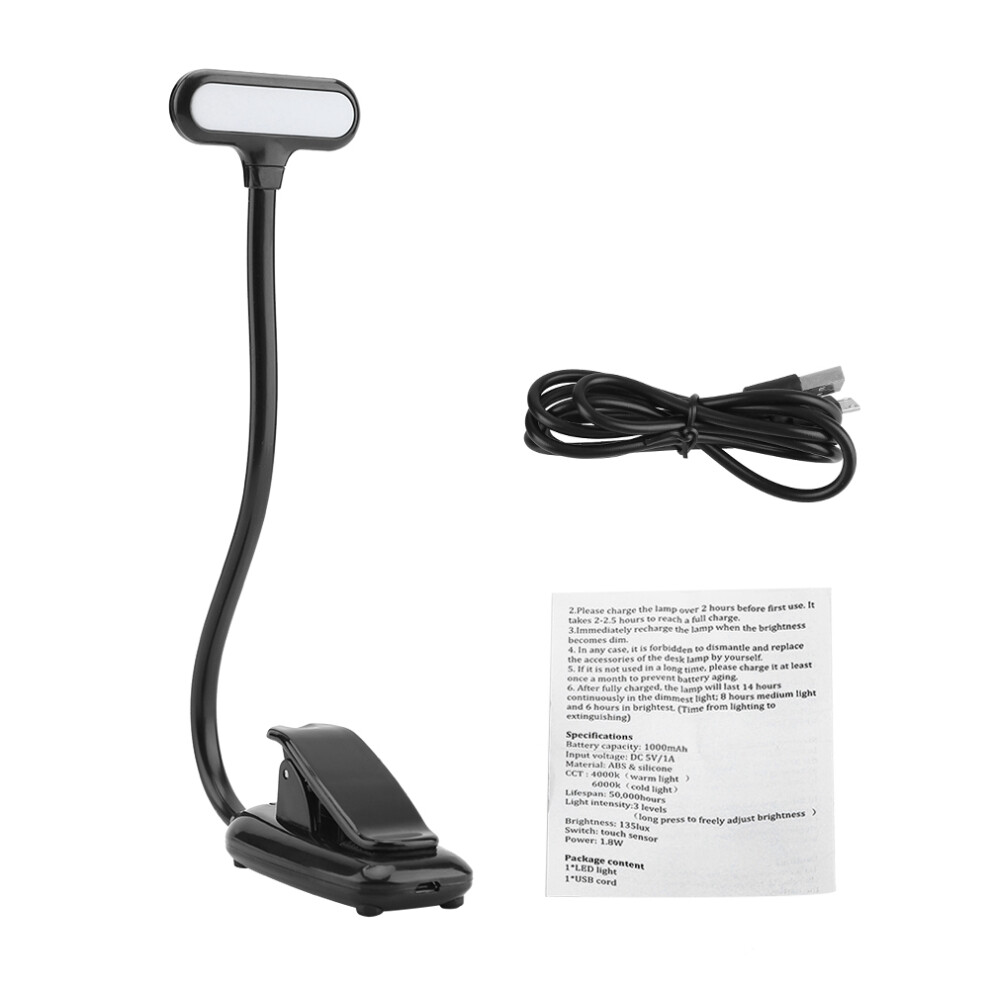 Reading lamp book clamp LED book lamp with continuously dimmable brightness, portable and flexible (Classic Black, White Light)