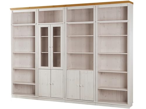 Anita Wall Unit 5 with 4 bookcases, 4 wooden doors and 2 glass doors in white honey, 296x34x223 cm