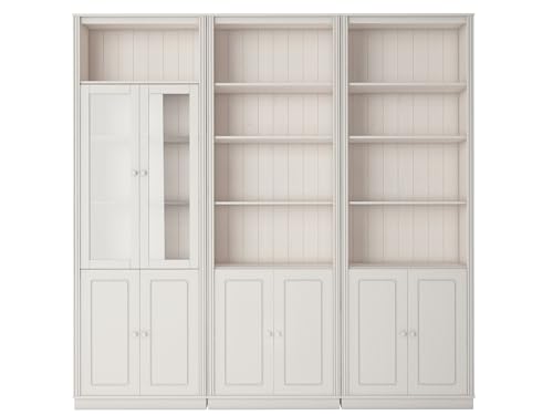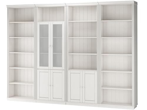 Anita Wall Unit 5 with 4 bookcases, 4 wooden doors and 2 glass doors in white lacquer, 296x34x223 cm