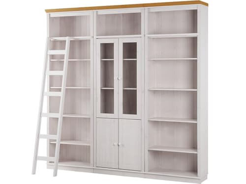 Anita Wall Unit D with 3 bookcases, 2 glass doors, 2 wooden doors and 1 ladder in white honey, 222x34x223 cm