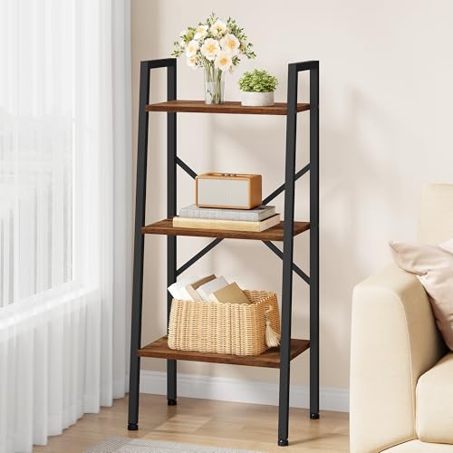 Hoctieon 3-Tier Industrial Ladder Bookshelf, Narrow Ladder Shelf, Tall Standing Bookshelf, Skinny Open Ladder Shelf, for Living Room, Home Office, Kitchen, Bedroom, Metal Frame, Rustic Brown