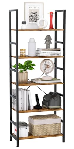 Yusong Bookshelf, Ladder Shelf 5-Tier Bookcase for Bedroom, Industrial Book Shelves Storage Rack with Metal Frame for Home Office, Gray Oak