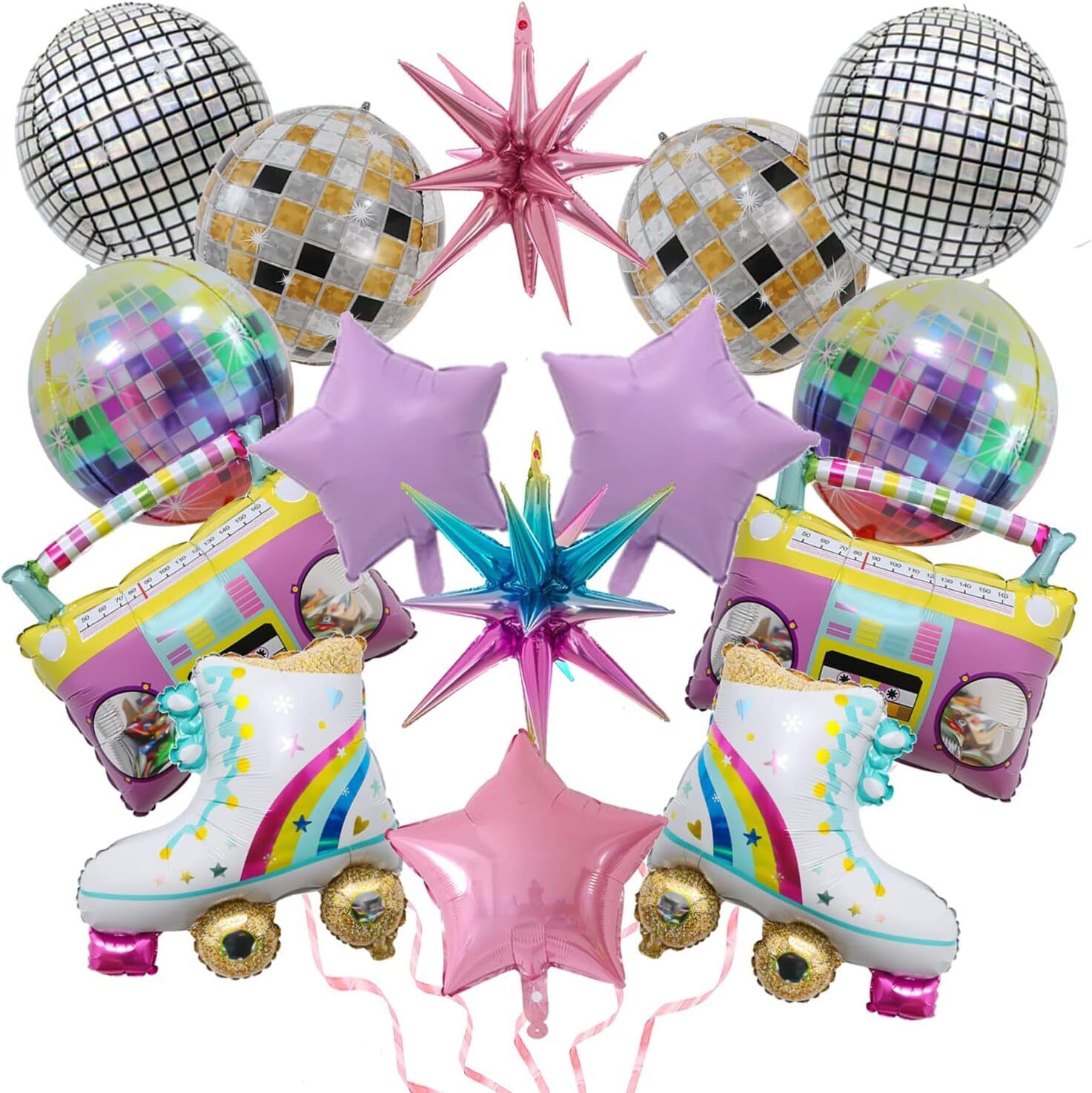 SimpleWild Retro Roller Skate Silver Sparkle Disco Orb Foil Balloon Disco Ball Party Decorations, Radio BoomBox Balloon 70s 80s 90s Disco Theme, Balloons for Birthday, Wedding, Retro Party