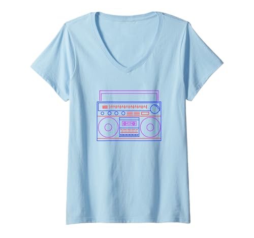 Women's Retro Colorful Boombox Synthwave Music Radio Lovers 80s-90s V-Neck T-Shirt