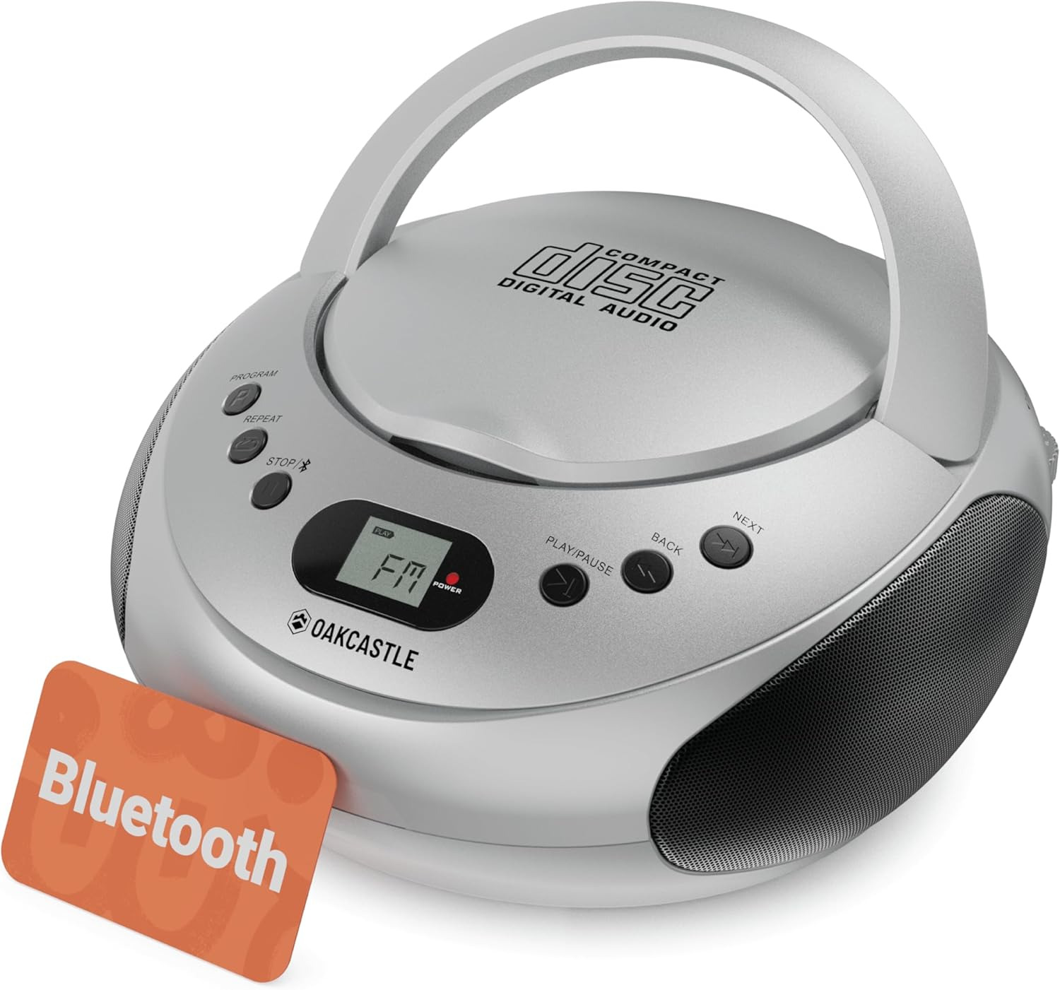 Portable Bluetooth CD Boombox with FM radio | CD, CD-R, CD-RW | 30 Presets | Easy Controls, LED Display, Headphone Jack | OAKCASTLE CD250 (Silver)