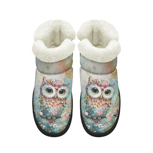 Kuiaobaty Watercolor Owl Print Womens Boot Slippers Fluffy Faux Fur Lined Bootie, Bohemia Owl Floral Painting Warm Winter Slippers Memory Foam Ankle Boots, Size 5