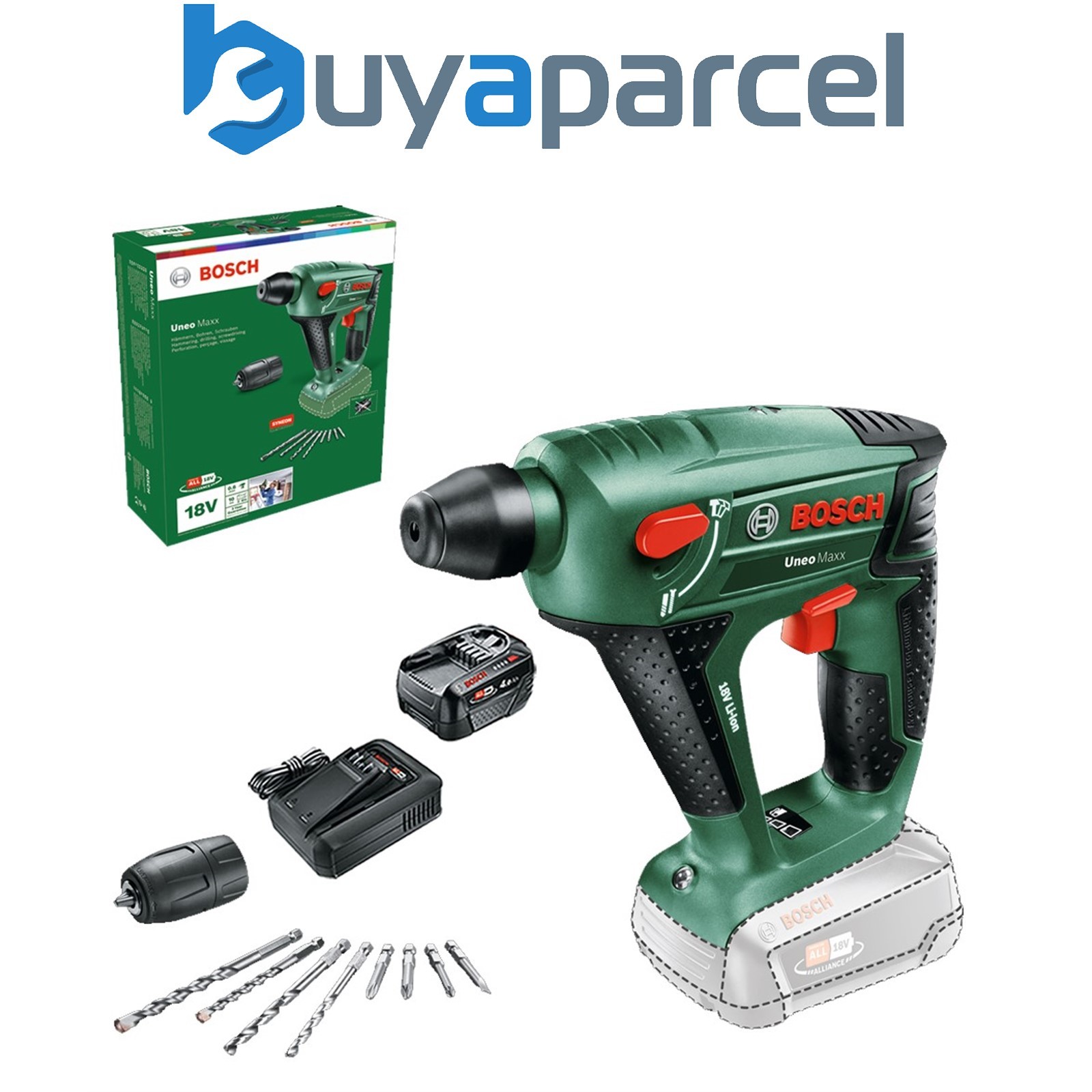 Bosch 060395230C 18v Rotary SDS Hammer Drill UNEO Maxx + Chuck 4AH Battery Kit