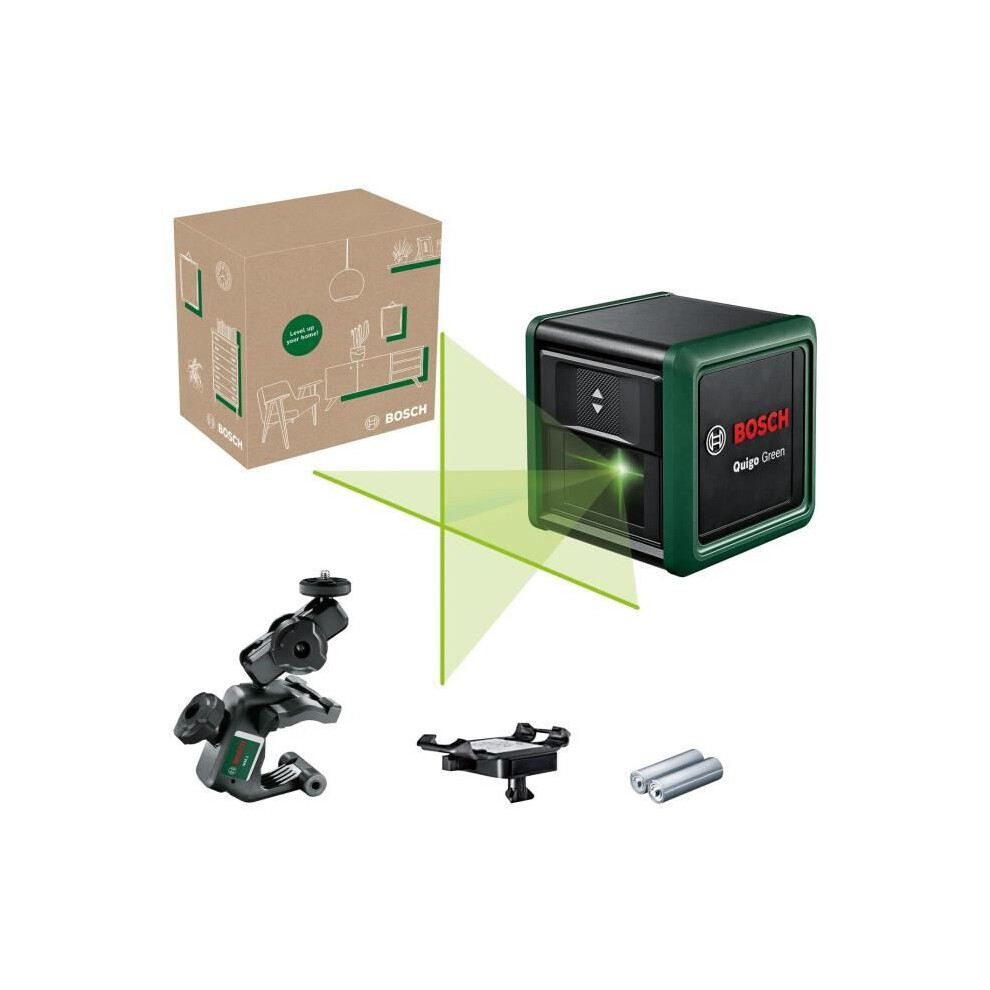 Bosch Cross line Laser Quigo Green with Universal clamp MM 2 (Green Laser for Better Visibility, housing Made of Recycled Plastic, in E-Commerce Cardboard Box)