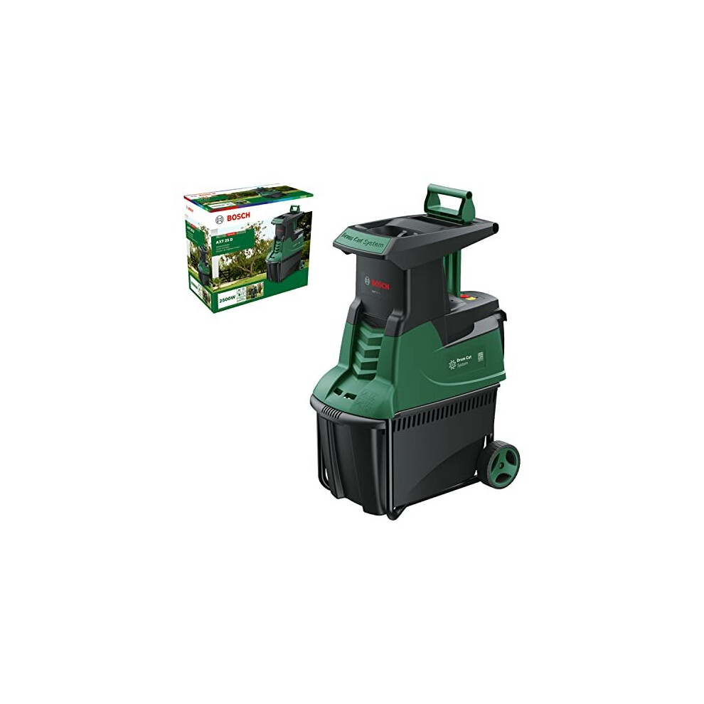 Bosch Quiet Garden Shredder AXT 25 D (2500 W; Suitable for Tough wood and Thorny Shrubs; Integrated Collection Box 53L; in Carton Packaging)