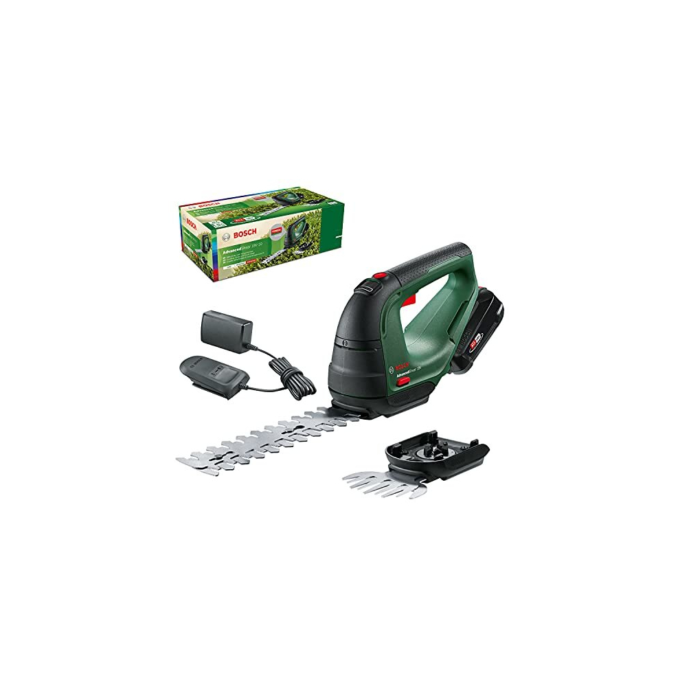 0600857070 Bosch Cordless AdvancedShear 18V-10 (1 2.0 Ah, 18 Volt System, cuts up to 85 m² per Battery Charge, with Shrub and Grass Shear Blades, in