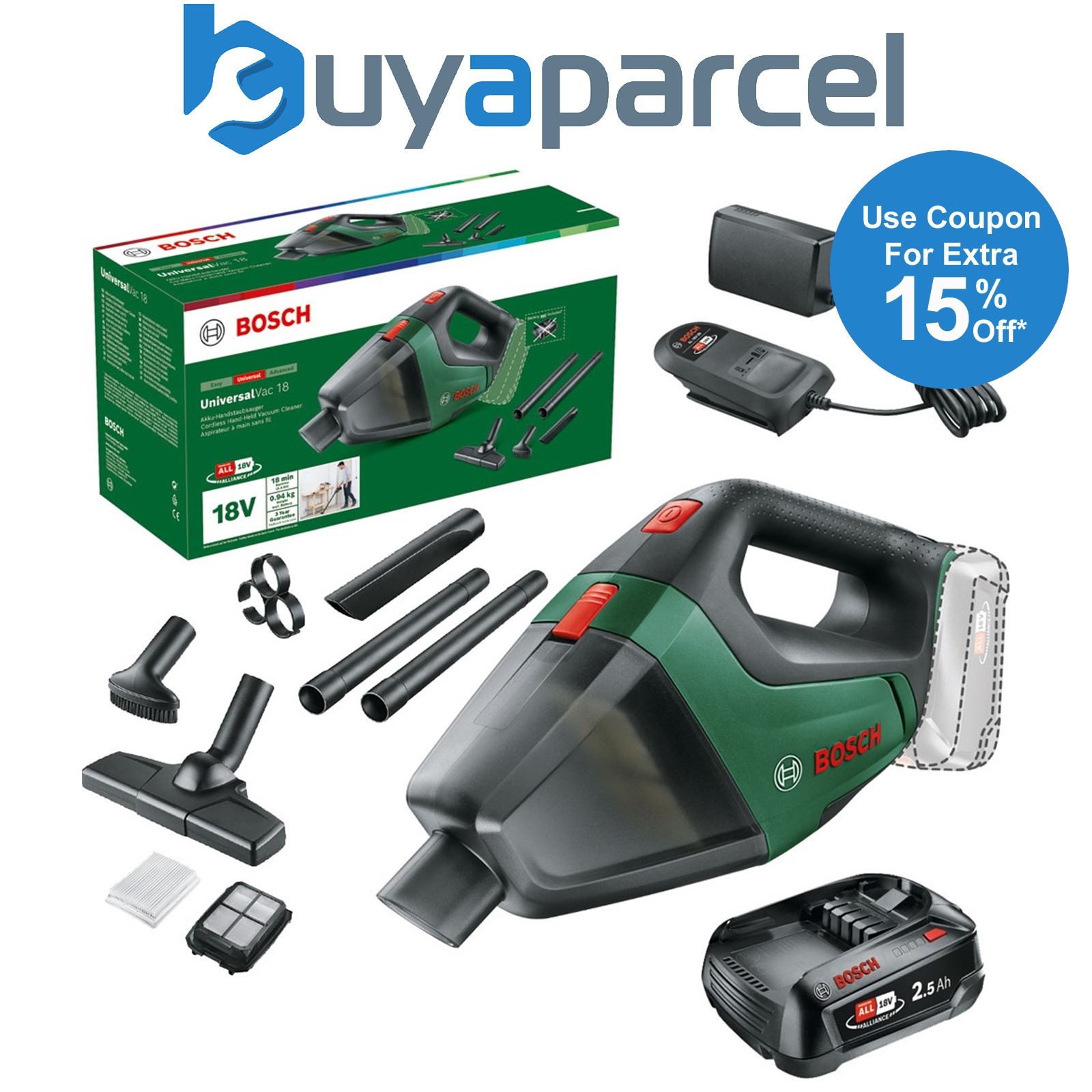 Bosch 06033B9102 18v Vacuum Cleaner UniversalVac + Nozzles + 2.5AH Battery Kit