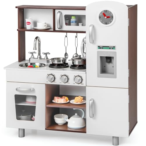 GYMAX Wooden Play Kitchen - Kids Toy Kitchen with Microwave, Fridge, Water Dispenser, Telephone, Oven, Cookware, Clock & Stove Pretend Playset for 3 Year Old + (White + Brown)