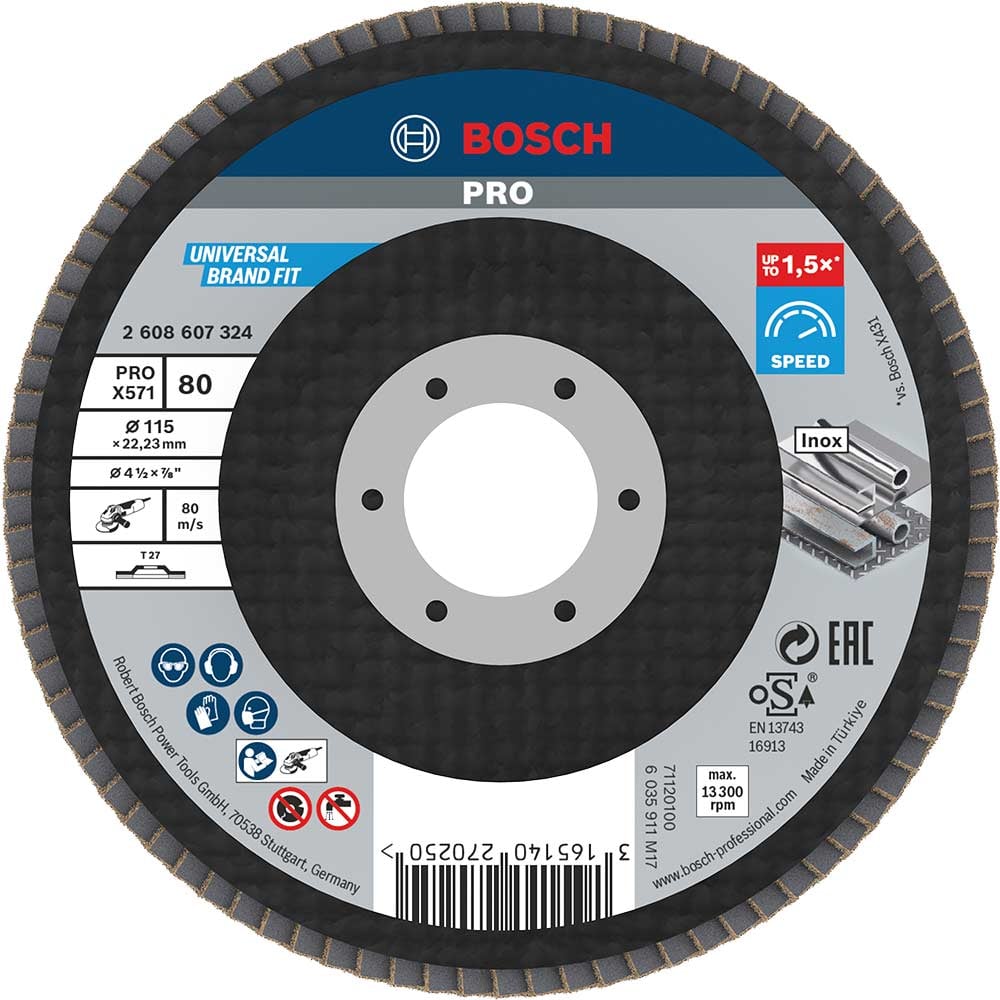 Bosch 1x PRO Metal X571 Flap Disc Straight Version Fiber for Small Angle Grinders (for Steel, Stainless steel, Ø 115 mm, Grit 60, Professional Accessory Small Angle Grinder)