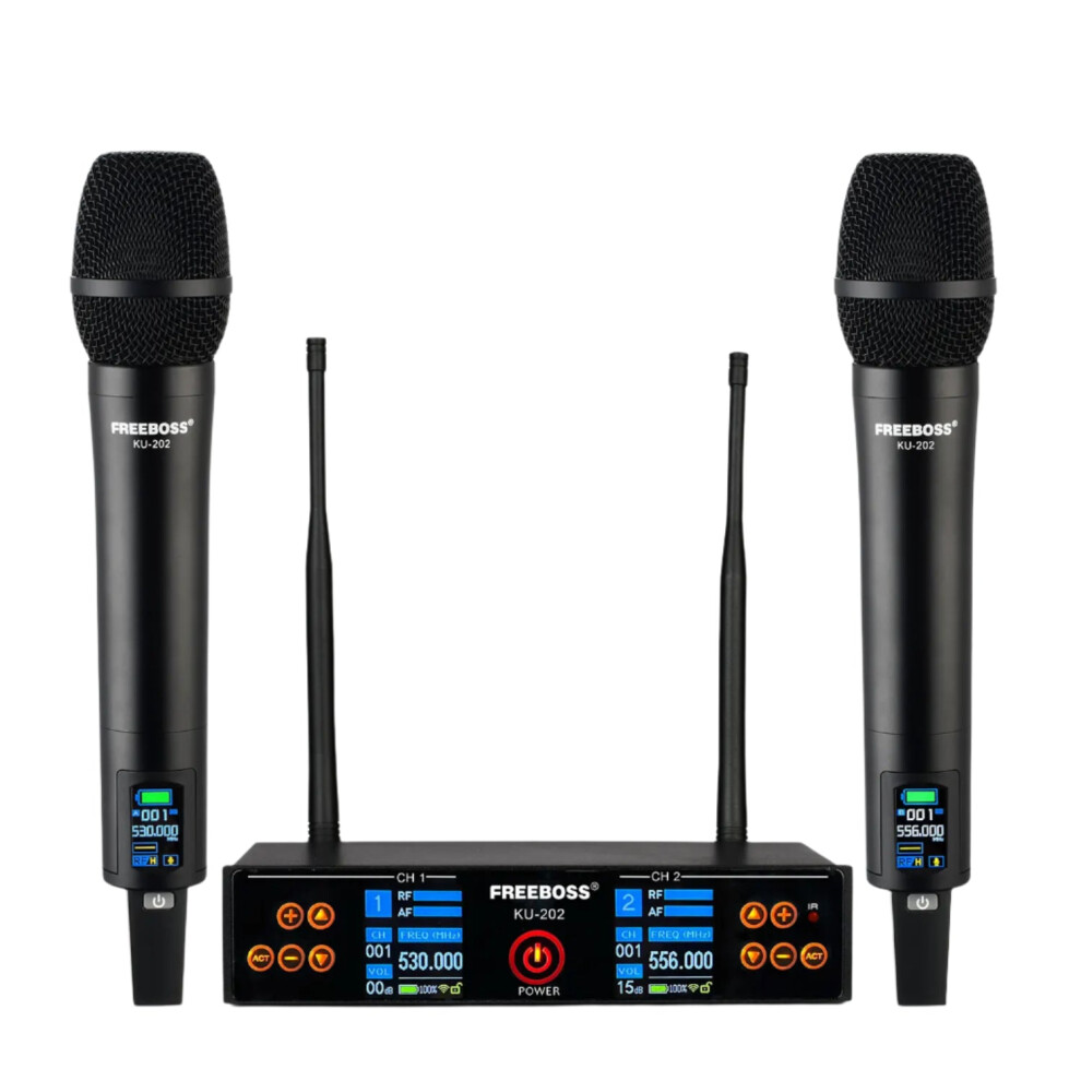 FreeBoss KU 202 Rechargeable Wireless UHF Dual Microphone with Adjustable Frequency & EQ for Professional Karaoke Performance