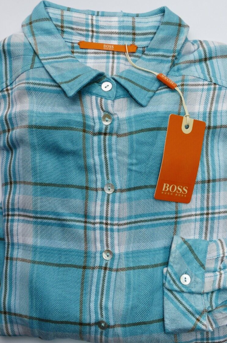 New HUGO BOSS womans ladies blue checked smart casual cotton blouse shirt SMALL