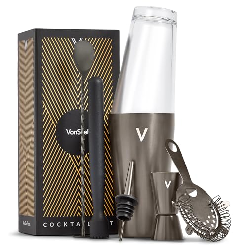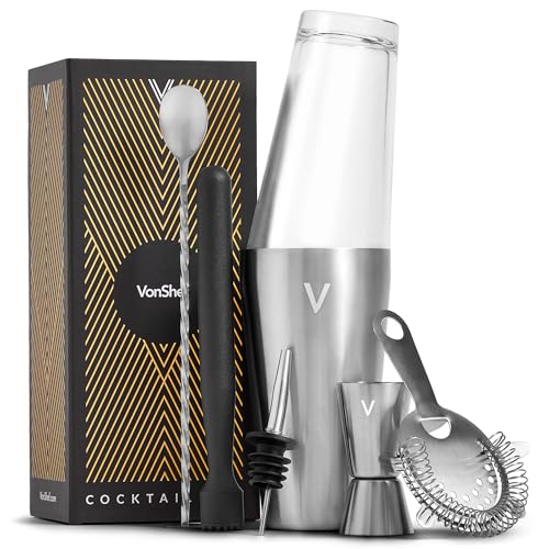 VonShef Cocktail Shaker Set, Silver 6pc Set with Boston Cocktail Shaker, Bartender Kit with Strainer, Muddler, Jigger & More, Gift Box Included