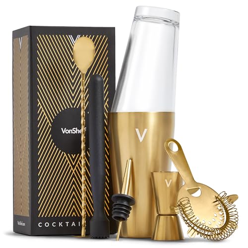 VonShef Cocktail Shaker Set, Gold 6pc Set with Boston Cocktail Shaker, Bartender Kit with Strainer, Muddler, Jigger & More, Gift Box Included