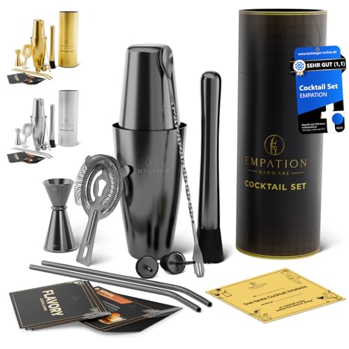 EMPATION Cocktail Shaker Black, 9-piece Cocktail Set with 825 ml Boston Shaker, Cocktail Accessories incl. Recipe Cards, Cocktail Making Kit for Beginners & Professionals, Cocktail Shaker Set