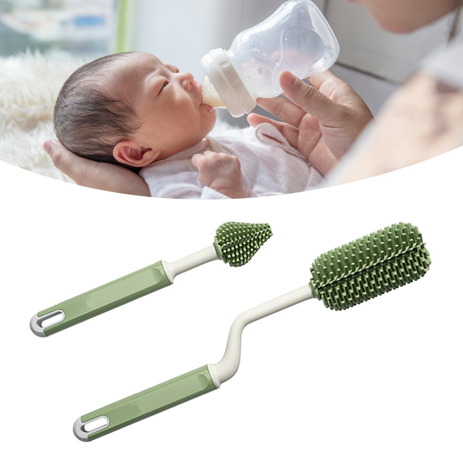 Green Baby Bottle Cleaning Brush Set With Bottle Clip Safe Food Grade Silico NEW