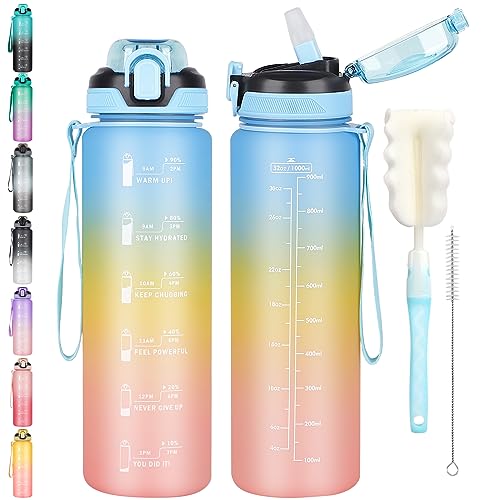 CodiCile 1L Water Bottle with Straw,Water Bottle Dishwasher Safe,Leak-proof Sports Drinks Bottle with Time Maker & Bottle Brush,Non-Toxic for Running,cycling, Gym, School & Office,Blue Yellow Pink