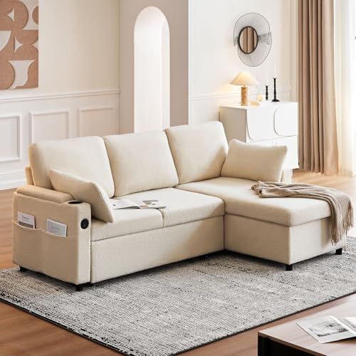 CLIPOP Boucle Corner Sofa 3 Seater L Shaped Sofa Bed with Storage Chaise Pull Out Sleeper Couch with USB Ports and Armrest Storage for Living Room (cream boucle, L shaped sofa)