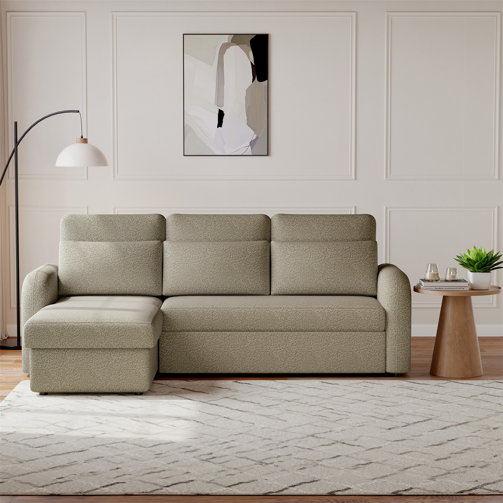 FLYN L-Shape Beige 3-Seater Boucle Pull Out Sofa Bed with Cushions