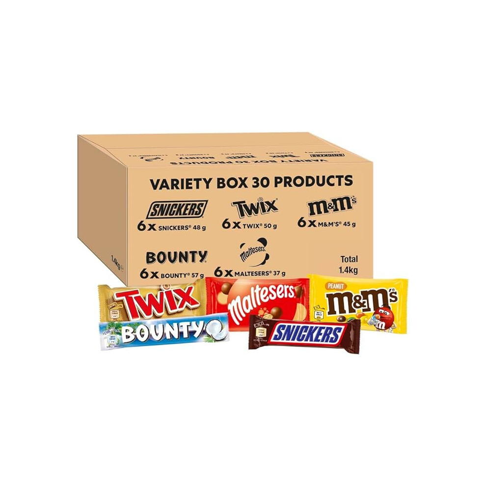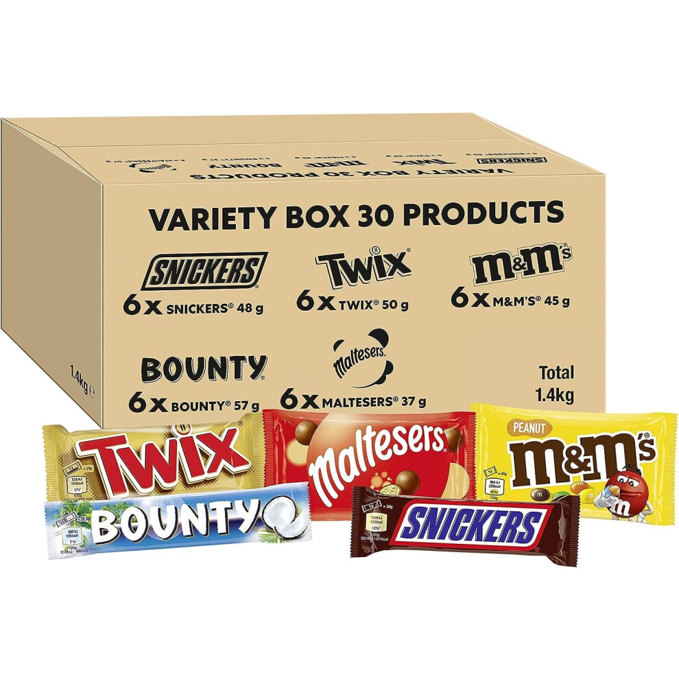 Mixed Chocolate Bar Variety Bulk Box - 30 Bars (1.4kg): Snickers, Twix, M&M's, Maltesers & Bounty