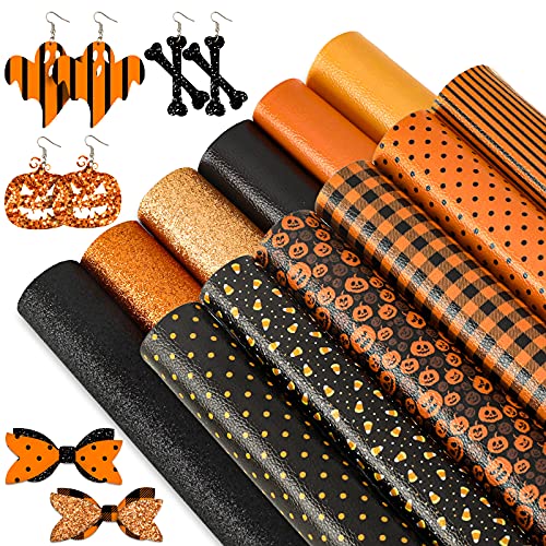 Whaline Halloween Faux Leather Sheets 8 x 12 Inch Pumpkin Plaid Dots Stripe Synthetic Leather Fabric Glittery Black Orange Faux Leather for Halloween DIY Craft Earring Hair Bow, 12 Sheet