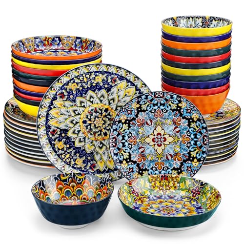 vancasso Dinner Sets for 12 People, Simi Dinnerware Dish Set Artisanal Pieces with 10.5in Dinner Plate, 8.5in Dessert Plate, 780ml Pasta Bowl and 950ml Cereal Bowl, Boho Colourful Tableware