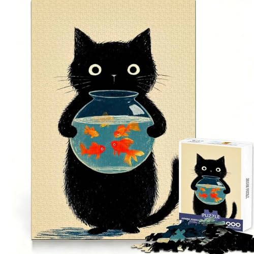 Black Cat with Goldfish Bowl Jigsaw Puzzle for Teenagers 1000 Pieces Mind Power Gentle Pastime Uniform Edges Memorable Gift (50x75cm)