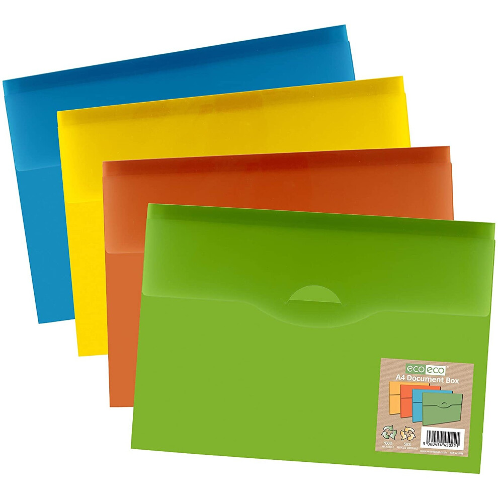eco-eco A4 50% Recycled Slim Document Box File Folder - Pack of 4 Assorted Colours